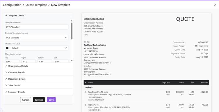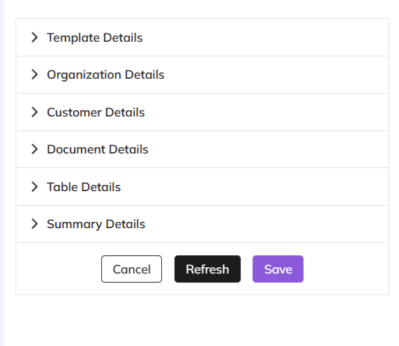 - Template Details- basic layout of the document and major customizations in font, alignment, theme, etc.