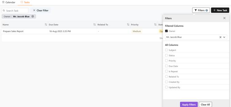- Now, you will only see tasks whose owner Jaccob Blue is.