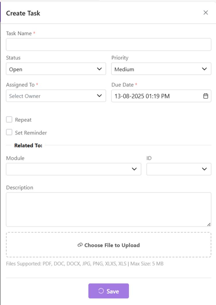 In a CRM system like Zhylar, tasks are activities or to-dos. They are linked to leads, deals, or contacts. These tasks help teams stay on top of their sales process. Tasks can include follow-up calls, meetings, sending proposals, or reminders for payment collection. They ensure accountability. They prevent missed opportunities. They keep every team member aligned by clearly defining what needs to be done, by whom, and by when.