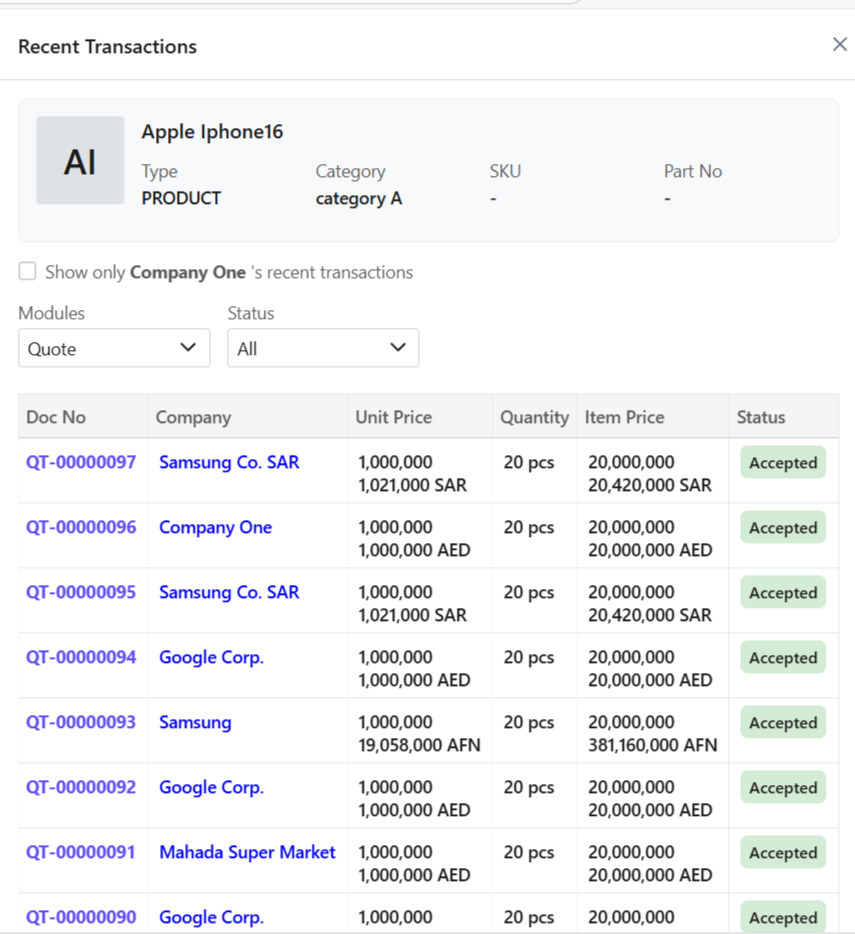 Recent transactions in Zhylar provide a quick view of an item’s latest activity. They show when, how, and at what price it was quoted or sold. They also show to whom it was sold. It tracks usage across quotes, sales orders, invoices, and even lost deals. This offers a 360-degree picture of the item’s sales history.