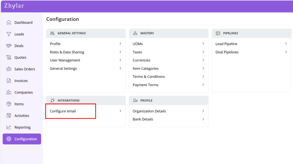 - Under Integrations tab, select Configure Email