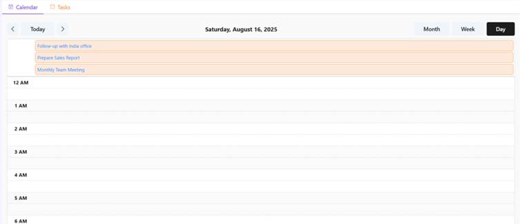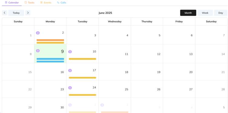 - By default, the page will take you to the Monthly overview of all activities. Some events and calls have been added for the 9th and 10th of June 2025.