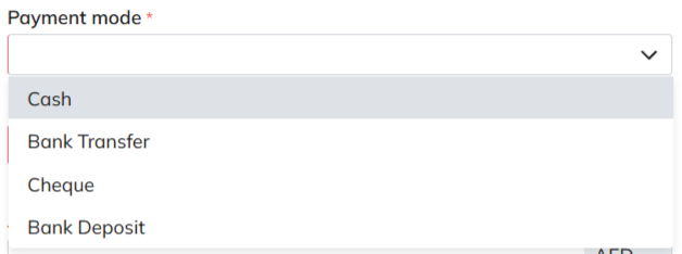 - When selecting mode of payment, except cash, all other payment modes will require you to add a bank.