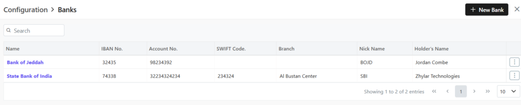 - When a bank is added to any document, the field drop down will carry the bank’s nick name.