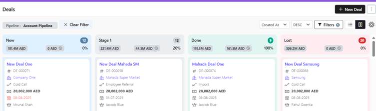 - Visual Pipeline Tracking – See deal stages at a glance with color-coded cards