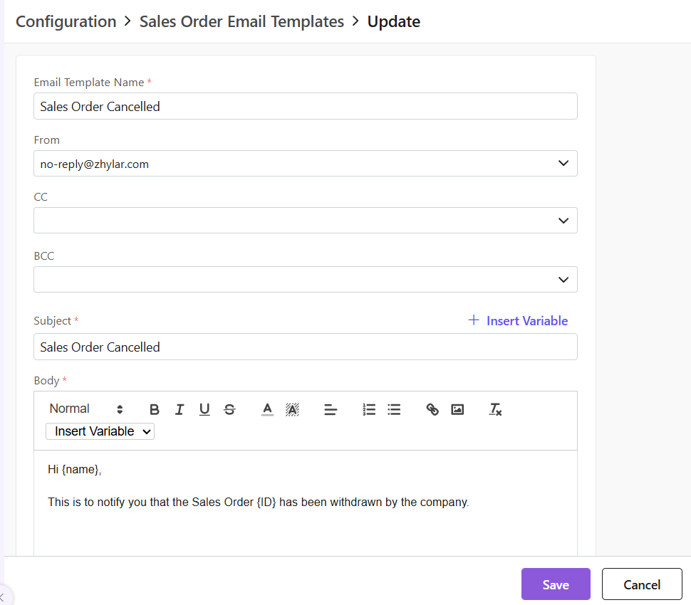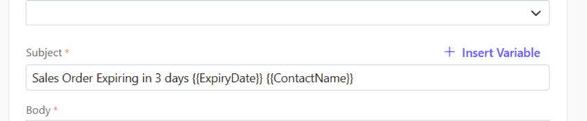 - Insert variables if required to customize your template. Variablesare placeholders used to dynamically insert specific data—such as a customer’s name, deal value, or due date—into templates, emails, or documents