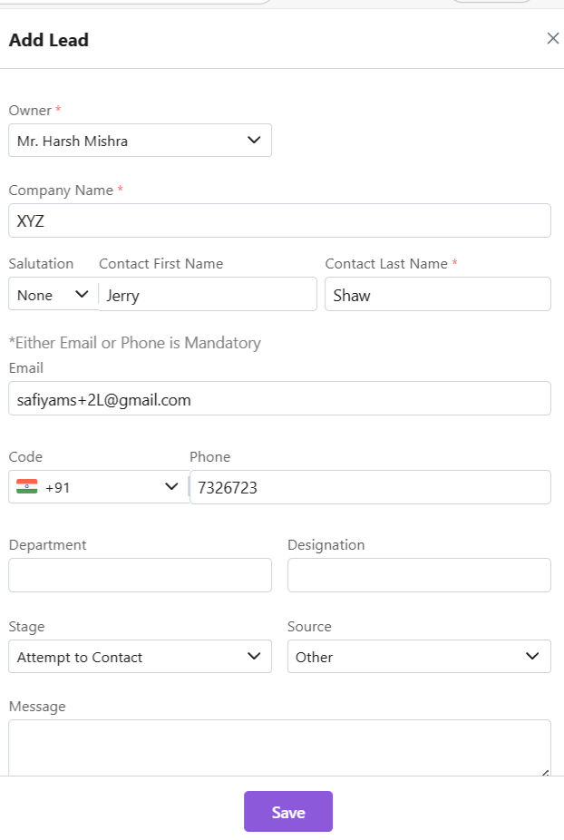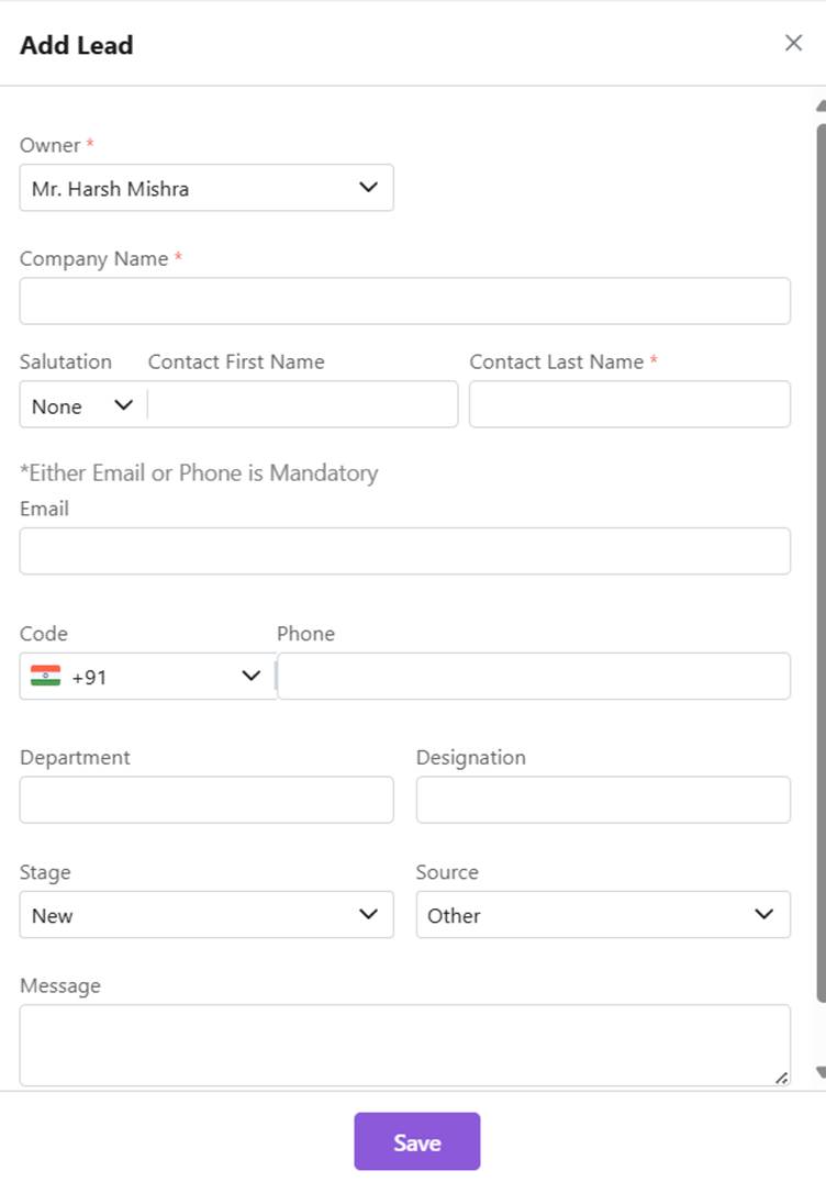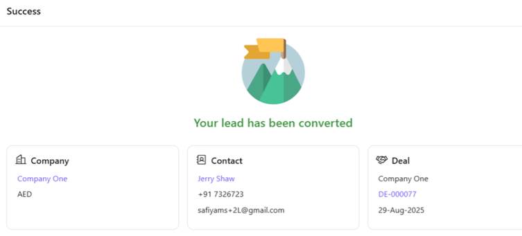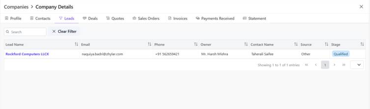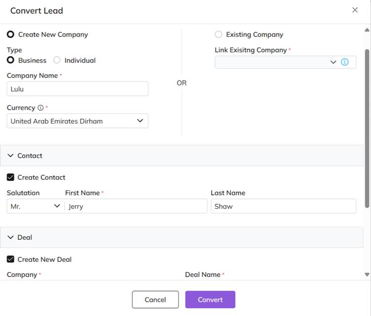 - The Lead must be linked to a company (existing company or create new) with the data provided.